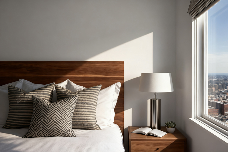 In feng shui, it's ideal to position the head of your bed against a solid wall for a sense of stability and security. Avoid placing the headboard or the head of your bed near windows or directly beneath them to maintain balanced energy.